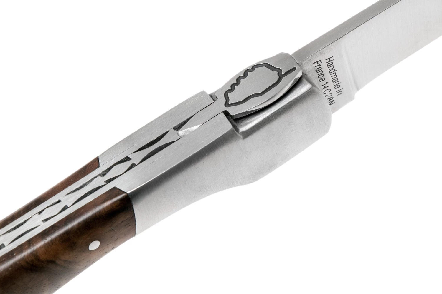 Les couteaux corses de la série Sperone (ce qui signifie éperon) sont un peu plus robustes que les autres couteaux de Fontenille Pataud. Les contours de l’île de Corse sont gravés dans la mouche sur le couteau. Sur la lame vous voyez la “Tête de Maure”, le symbole de la Corse. Manche en bois de noyer.
