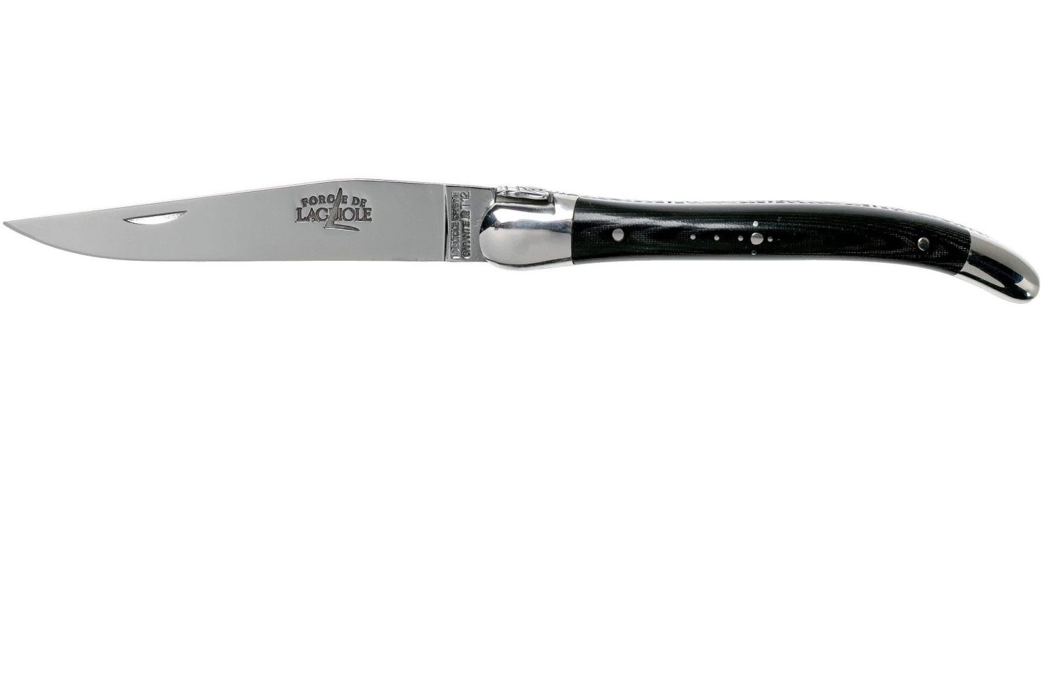 Ce Forge de Laguiole 129 est un superbe couteau Laguiole à un prix très intéressant. La lame a une finition polie, tout comme les mitres. Le manche est en micarta. Un matériau composite fait avec de la résine et de la fibre de verre.