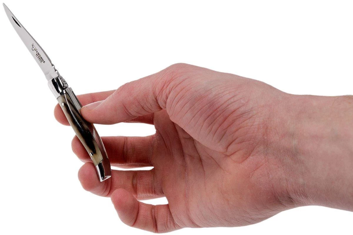 Ce couteau de poche Laguiole en Aubrac 7 cm est un couteau Laguiole classique. Le manche est en corne. Le dos du manche est richement décoré avec un magnifique guillochage. La lame est en acier Sandvik 12C27 résistant à la corrosion. Les mitres et la lame ont une finition polie.