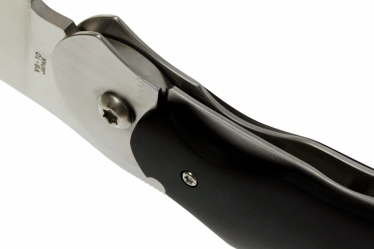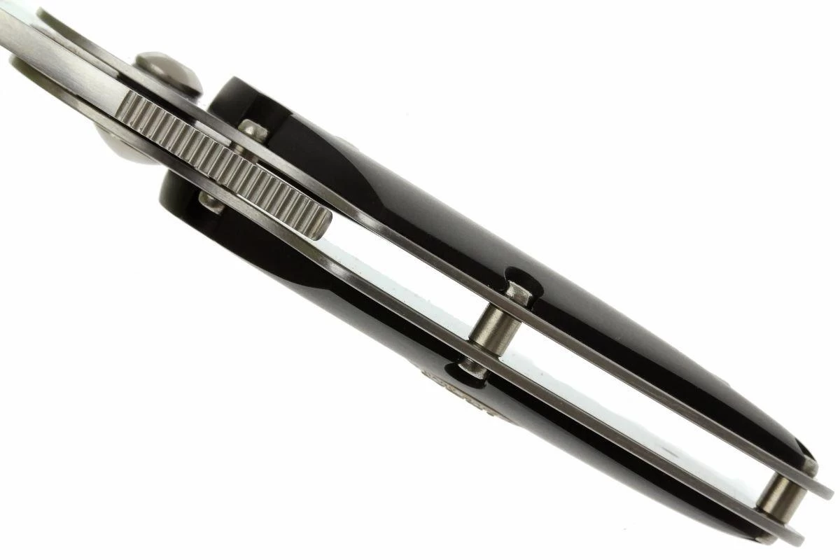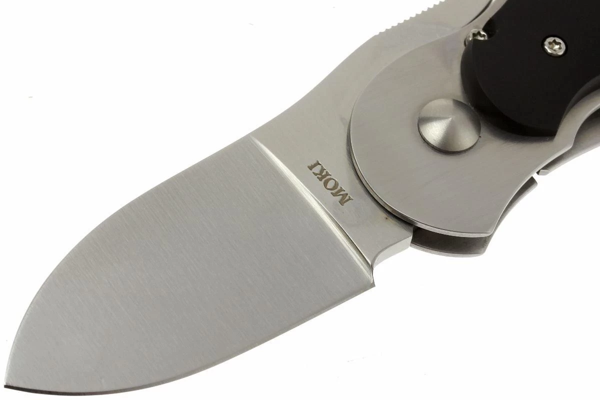 Le Rabbit de Moki est un couteau de poche compact avec une forme très spéciale. Un petit levier permet à la lame de sortir très facilement. Ceci est possible autant avec une qu’avec deux mains. Vu le genre du couteau, souvent vous le ferez à deux mains. Avec votre pouce dans le bombement sur le dos et votre index sur le levier, vous ouvrez de forme naturelle la lame en acier VG10. Par le fait que le couteau soit un peu plus élevé, vous avez énormément de prise. Les nervures sur le levier augmentent encore plus la prise. La lame est verrouillée en position ouverte avec un framelock.