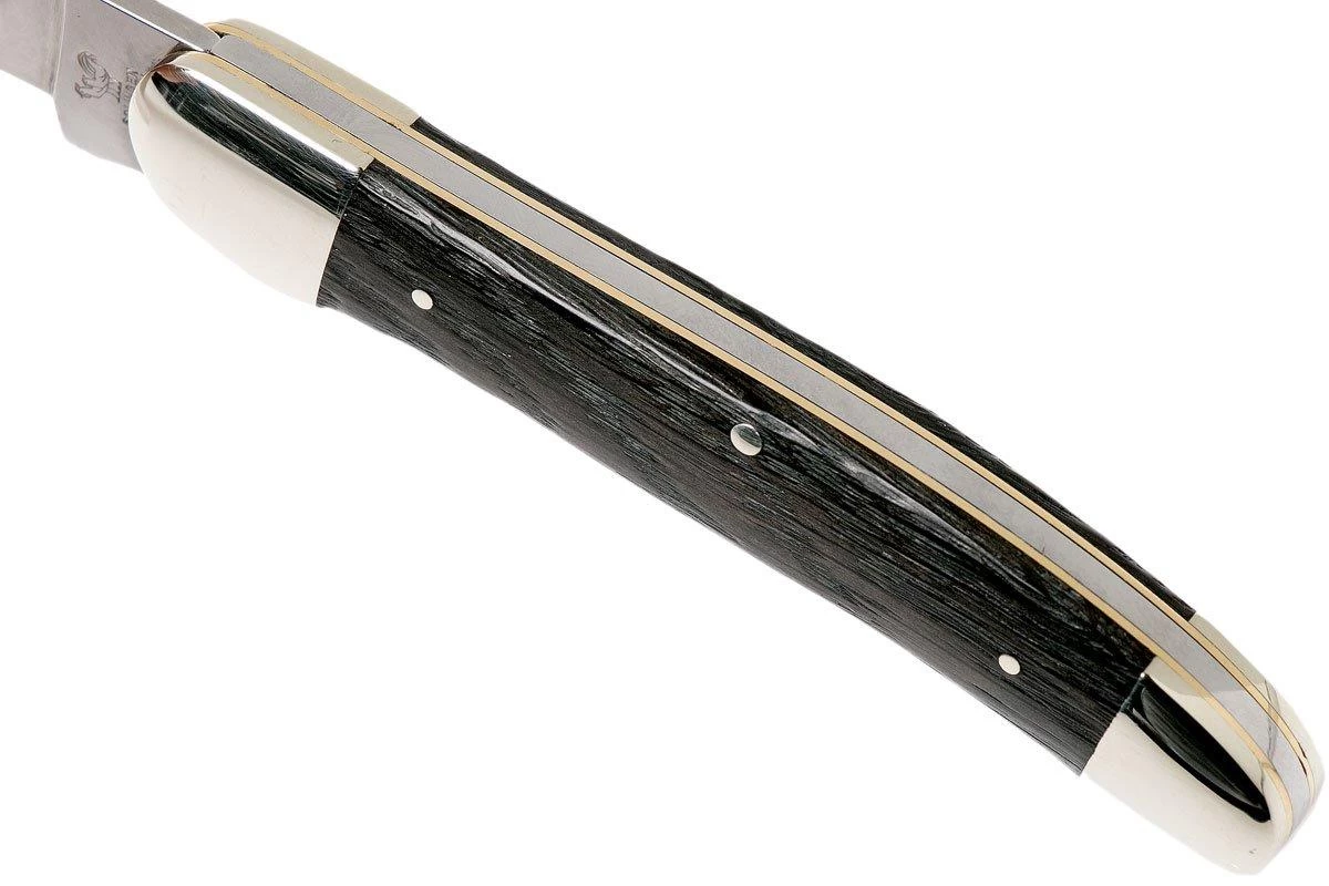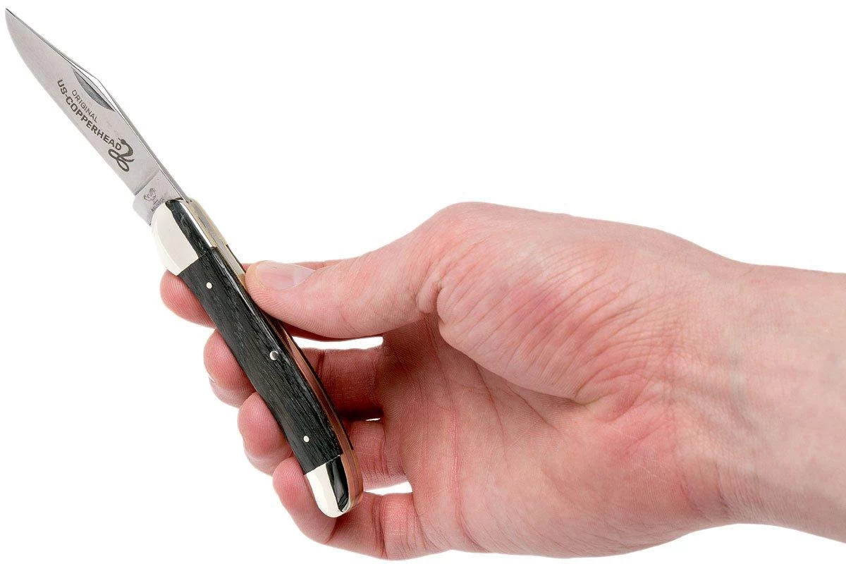 Le Robert Klaas US Copperhead est un couteau de poche chic et traditionnel, fabriqué à Solingen. Il s’agit d’un vrai Copperhead que vous reconnaitrez par le petit renflement au milieu du manche. Il sert de rainure pour les doigts mais il cache également l’arrière aiguisé de la lame lorsque le couteau est fermé.