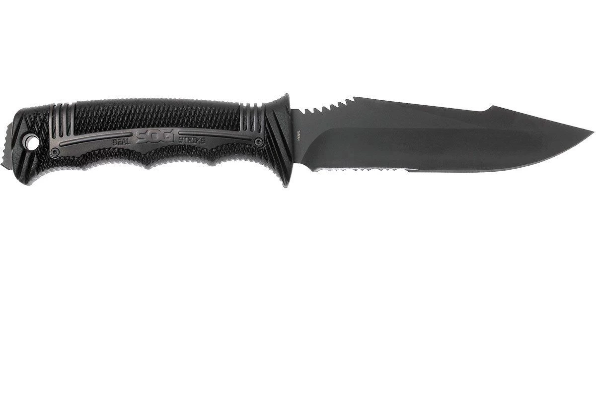 Le SOG Seal Strike est un couteau fixe solide et robuste, qui a tout à fait sa place dans la gamme SOG Seal. SOG a une bonne réputation à maintenir en matière de couteaux de combat. Le SOG Seal ne va certainement pas nuire à celle-ci. Le manche en nylon renforcé de verre et en acier inoxydable tient bien en main. La lame est en pleine soie, ce qui veut dire que l’acier qui dépasse du pommeau est le même que celui de la lame. La lame est faite en acier AUS8 et est partiellement dentelée. Parfait pour couper de la corde par exemple. Le renflement au dos de la lame permet une meilleure prise à deux mains lors de travaux de précision.