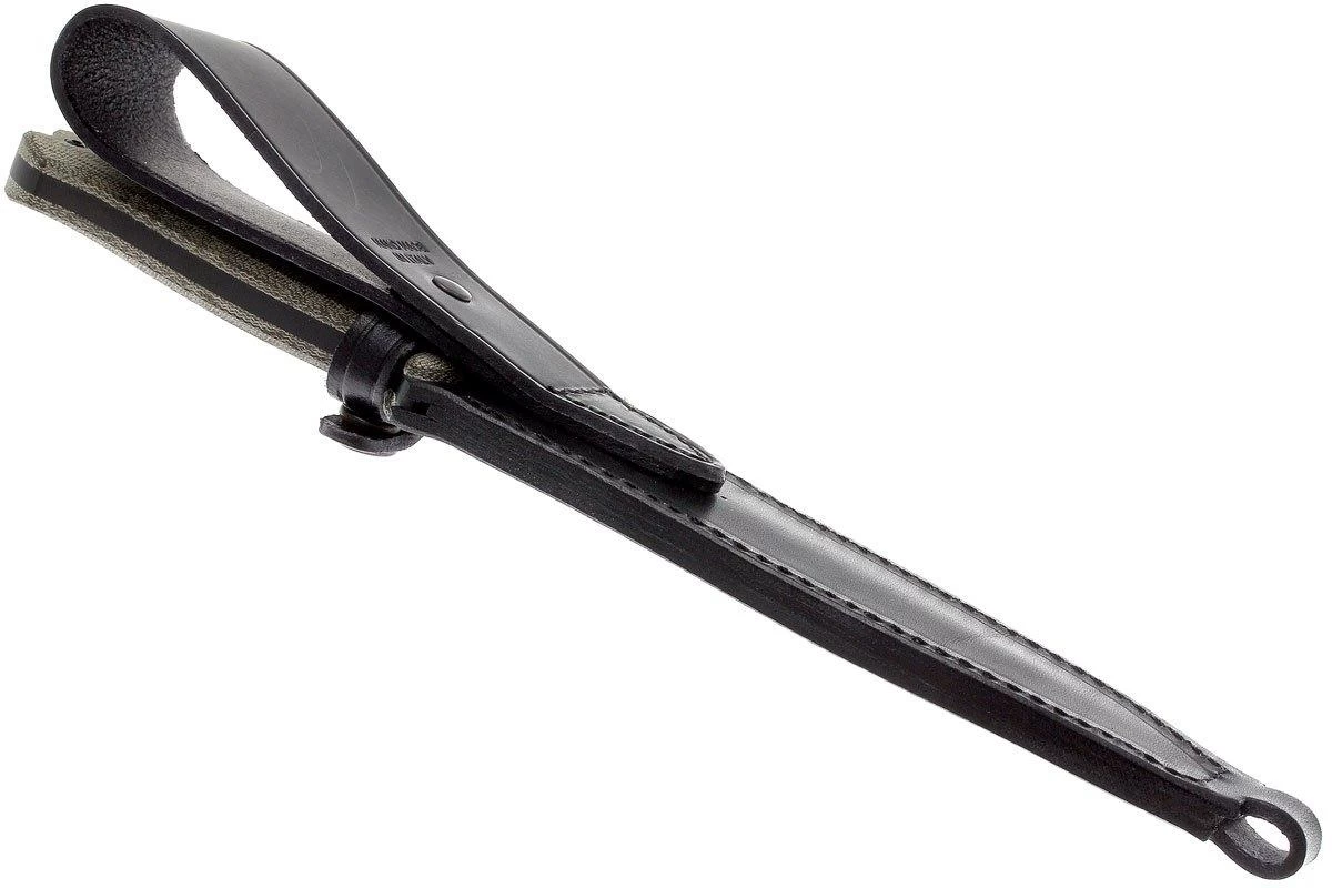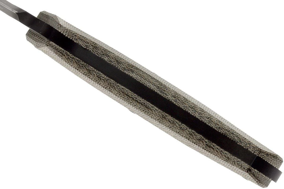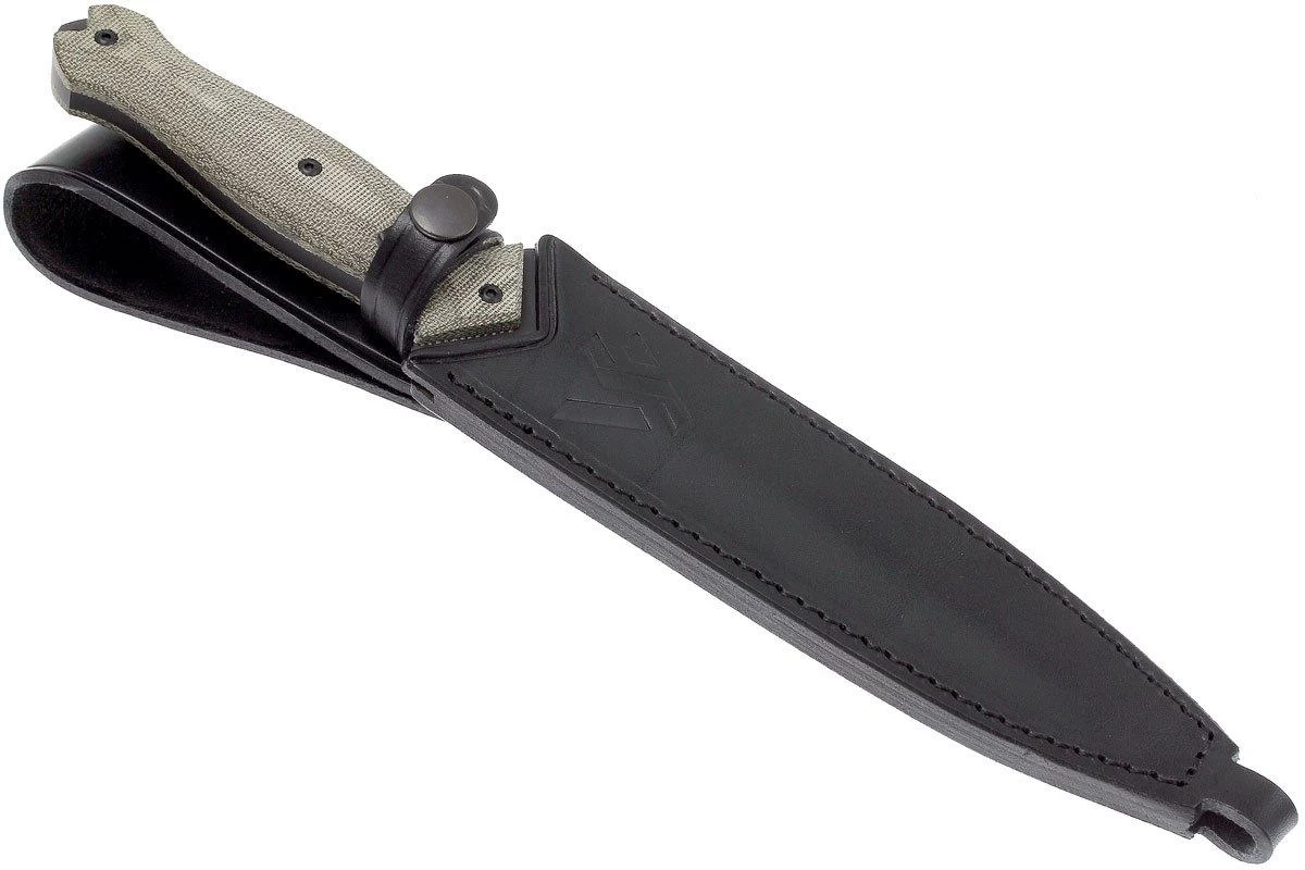 La Steel Will Fervor 1201 est une dague tactique à double tranchant. Avec une lame de 17 cm de long, c’est un outil imposant. La symétrie est impressionnante sur ce modèle. Mis à part le logo et l’inscription sur la lame, les deux côtés de ce couteau sont parfaitement identiques. La lame est en acier autrichien Böhler N690Co. Un acier célèbre pour son excellente qualité. Le revêtement noir militaire ASPIS MIL-DTL-13924 évite les réflexions, indispensable pour un couteau tactique. Le manche en micarta fraisé 3D offre une excellente accroche et est agréable à l’œil. Le micarta est un matériau composite de lin et de résine synthétique. Il offre une bonne adhérence en toutes circonstances, même quand on porte des gants ou qu’on a les mains mouillées. Le micarta est poreux et va former une patine au fil du temps, en absorbant l’humidité de votre main. Cela lui donne un look unique.