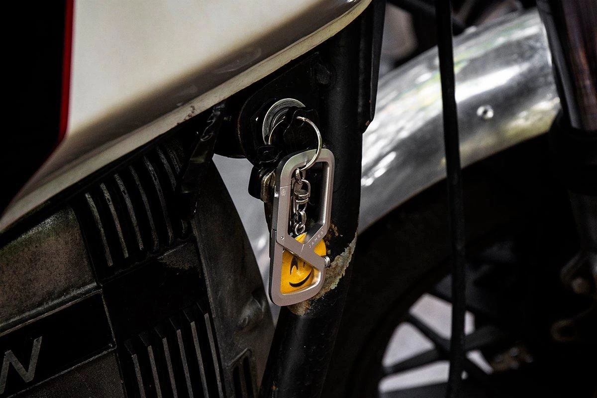 Le mousqueton The James Brand Mehlville est un mousqueton robuste en aluminium sur lequel accrocher vos clés ou outils. Vous pouvez facilement ouvrir le Mehlville en poussant le mousqueton à l’intérieur. Une fois les clés dans le mousqueton, vous pouvez pousser le mousqueton une seconde fois. De cette façon, les clés tombent dans la deuxième partie du mousqueton où elles sont en sécurité et ne peuvent simplement pas tomber. Le mousqueton est équipé d’un décapsuleur très innovant avec un disque en acier interchangeable. Ce disque en acier est fixé avec une vis dans le mousqueton et peut être remplacé si nécessaire. Comme ce disque est fait d’acier inoxydable durci, il s’usera moins rapidement que l’aluminium. Très pratique pour ouvrir un bon verre en fin de journée !